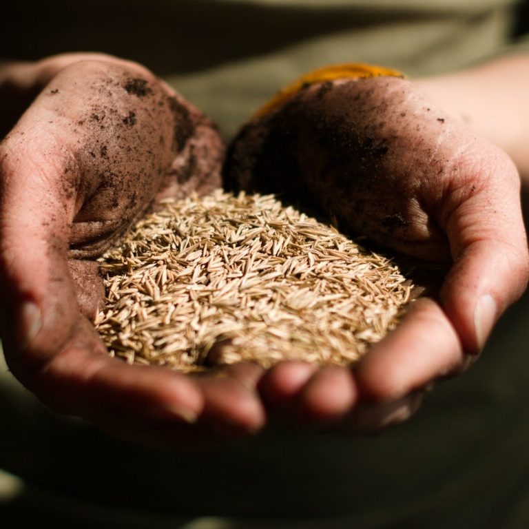 Spreading grass seed and covering with a multipurpose compost